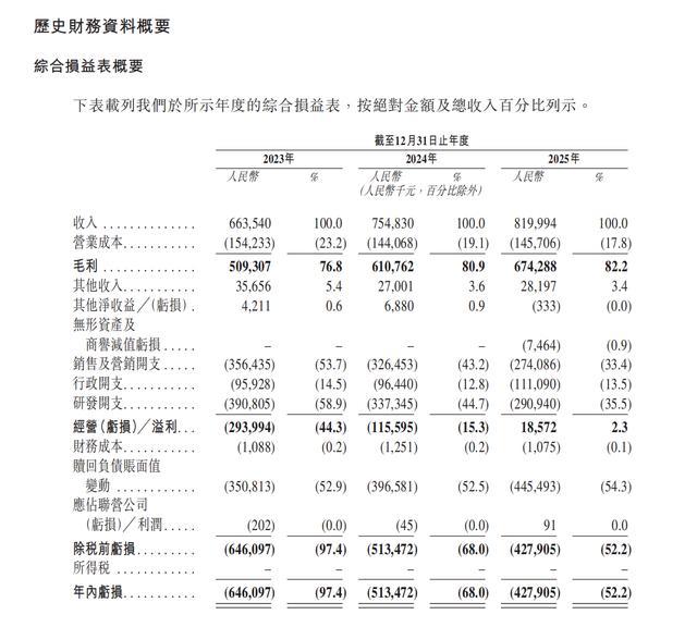 盈利方面,毛利率由76.8%提升至82.2%,销售及研发开支连续两年双位数缩减(累计下降超20%),推动经调整净利润于2025年首次转正至5710万元人民币(非IFRS口径)。IFRS口径下仍录得净亏损4.28亿元,主要因为优先股赎回负债的公允价值变动。