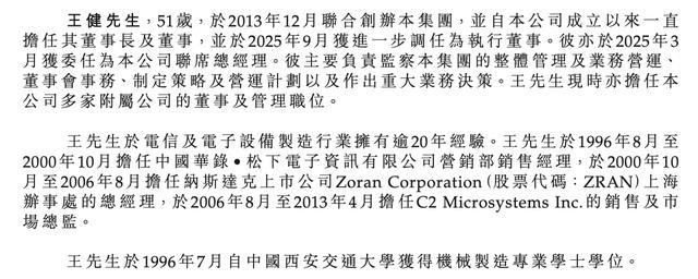 资料显示,王健,51岁,于2013年12月联合创办集团,并自公司成立以来一直担任其董事长及董事,并于2025年9月获进一步调任为执行董事。其亦于2025年3月获委任为公司联席总经理。其主要负责监察集团的整体管理及业务营运、董事会事务、制定策略及营运计划以及作出重大业务决策。王健现时亦担任公司多家附属公司的董事及管理职位。