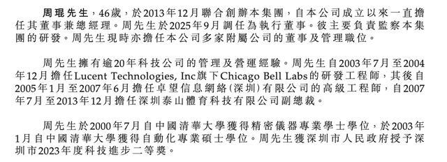 周琨,46岁,于2013年12月联合创办集团,自公司成立以来一直担任其董事兼总经理。周琨于2025年9月调任为执行董事。其主要负责监察集团的研发。周琨现时亦担任公司多家附属公司的董事及管理职位。